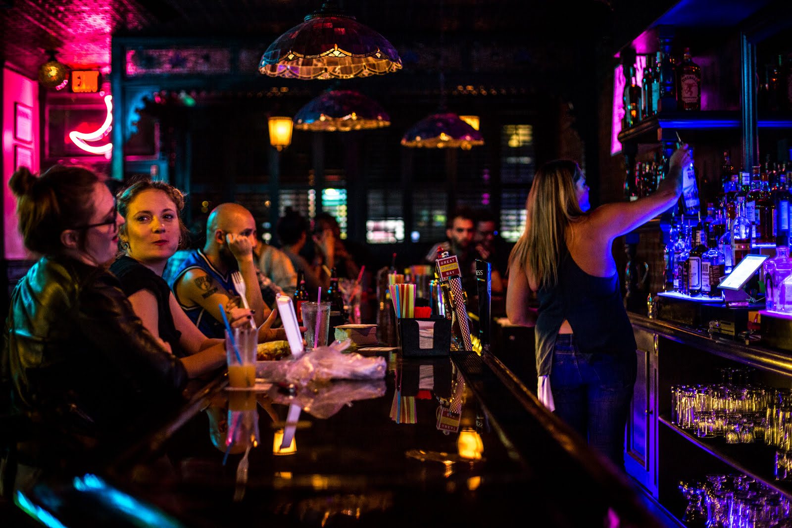 A neon crescent hangs over the door (a shout out to the Big Easy, the eternally endeared Crescent City) and reminds those coming and going that if we can’t be in New Orleans, we can still enjoy life as it comes while sipping on the finest of (frozen) daiquiris and enjoying the grand view from the front porch. The Holler is just what the neighborhood needed: a hub for the misfits and transplants of all ages, a place where history and culture brighten up the room in the most welcoming way possible. The Overlooking booths along Franklin Avenue mimic the ambience of Victorian porches one would find while wandering the side streets of New Orleans. Interiors built upon rich cherry wood and illuminated by stained glass Tiffany pendant lamps, the design pays homage to the deep South lust for luxe. These elements paired with alligator textured glitter wall coverings, always on jukebox and pinball machines and color controlled Phillips Hue LED lighting system to provide that Big Easy lively contrast.